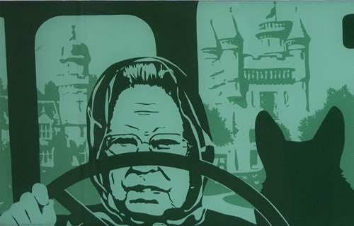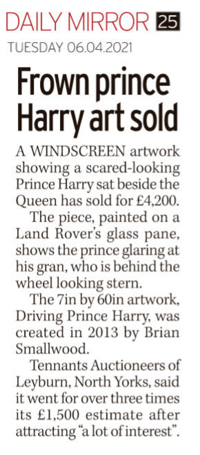 Driving Prince Harry. The Front windscreen from a series 3 Land Rover (1971 to 1985). The Queen is driving a nervous looking Prince Harry! The Land Rover windscreen was cleaned, the frame was sandblasted and sprayed with chrome powder. Using acrylic paint the artwork was ‘reverse painted’ on the windscreen glass – this means I start with my signature first!